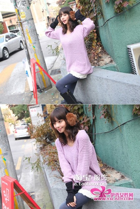 混搭。内搭长袖粉紫色毛衣,甜美粉嫩款式展现十足俏皮感。