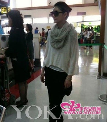 白色的宽松蝙蝠衫配上黑色的裤子用灰色丝巾绕在颈间简单随意。