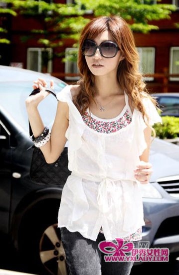 碎花吊饰真的很好看,但是单穿显得太随意。所以就搭配一件白色的罩衫吧,既能把又碎花的缤纷彩色体现出来,又能保持清凉。