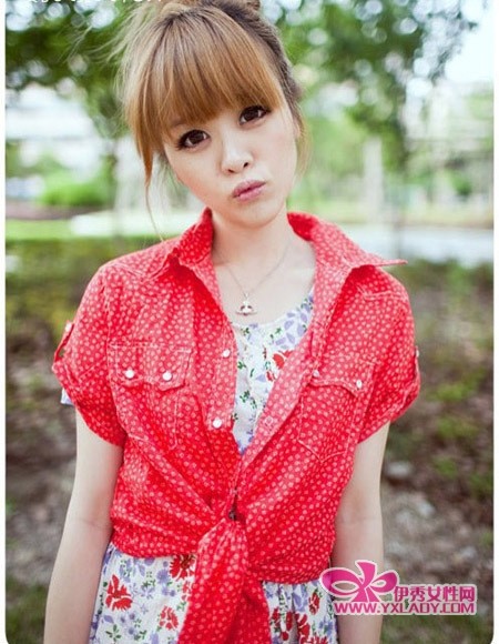 超人气百搭小碎花大红色绑带系带衬衣 ,淡黄色的小碎花加上大红色的底色,非常可爱。