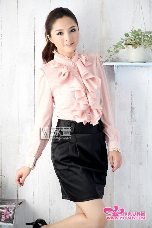 柔和的粉色衬衫有着繁复的荷叶边,非常烂漫,搭配同样质地的窄裙与高跟鱼嘴鞋,性感高挑,职场丽人形象跃然而出。