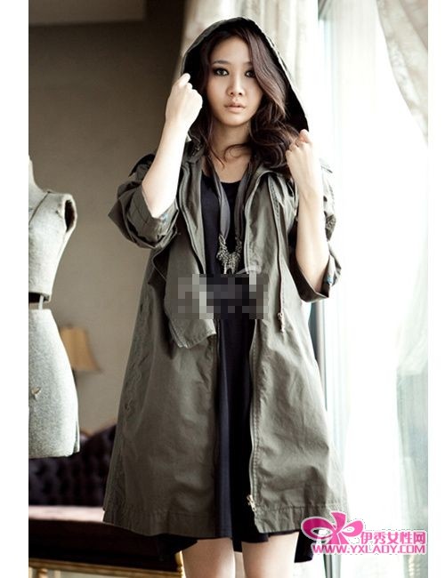 雨衣款风衣,材质厚实硬朗,更反衬出女性的温柔感。下身搭裤,会显得比较臃肿,建议下身搭配以短打为主,短裙、短裤,另外一双军装风短靴也不能少。