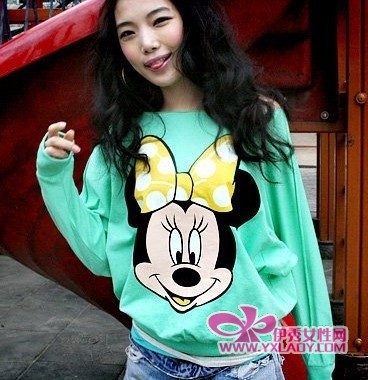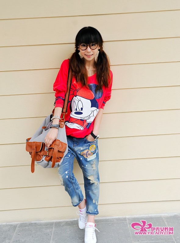 好可爱的搭配呀,可爱的米老鼠头像的卫衣宽松自在,亮眼的红色十分抢眼,宽松的卫衣可是百搭高手!