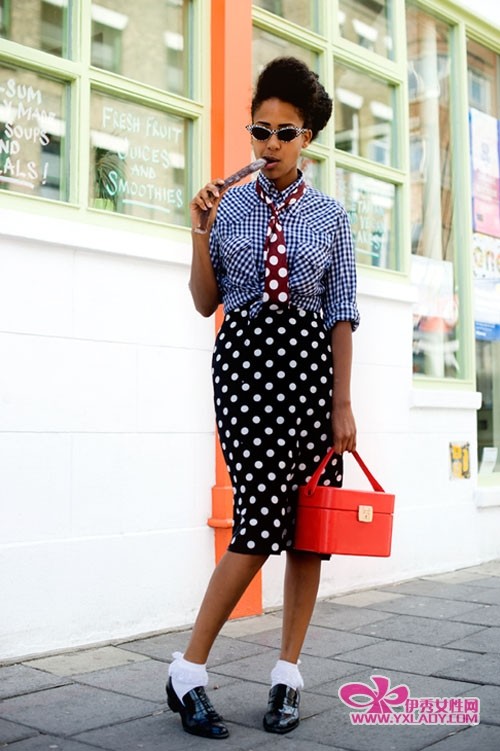 波点的中长裙以及领带,格纹的衬衫,加在一起看似眼花缭乱实则统一,翻边的白袜配上黑色尖头皮鞋,潮爆啦!