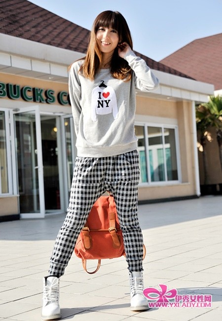 灰色的圆领卫衣,淡淡的色彩透彻干净,可爱的衣衣图案,制造了空间感,休闲中带着一丝优雅的淑女气。