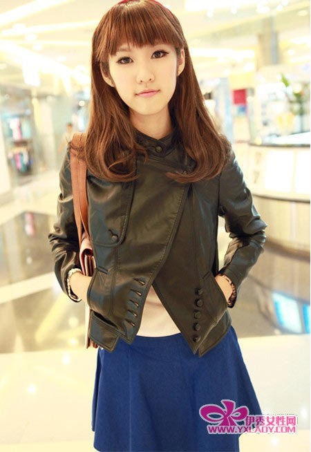 淑女派韩版新款可拆卸圆扣黑色皮衣小外套在五角场闲散而现代的节奏里更显风情。整体效果感觉非常淑女,除了肩章式的流行风格外,衣服上的小小包扣更显可爱!