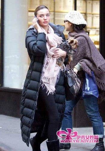 点评:身为超模的比例,当然需要一款特别长的保暖羽绒了,Miranda用全身黑来包裹自己,最有搭配一条粉色的围巾,以此达到减“重”的效果。