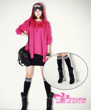 亮粉色的套头衫最出众,下搭黑色的短裙就好。一双黑色的长筒袜点缀白色条纹,很像小时候男生的运动袜,搭配一双黑色靴子,感觉相当个性。