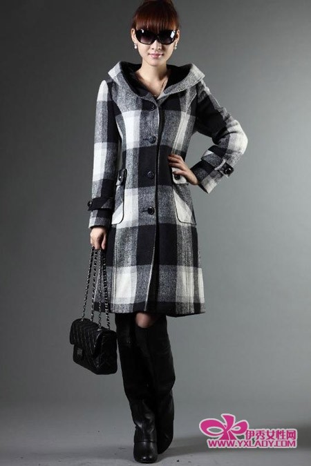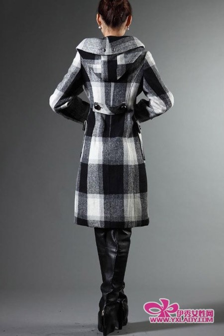经典的黑灰格子充满英伦风,荷叶领连帽设计独特新颖,微微收腰的设计更能展现女人妙曼身姿。
