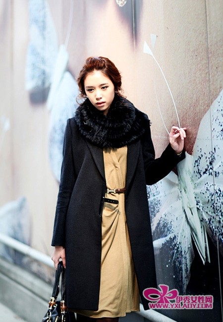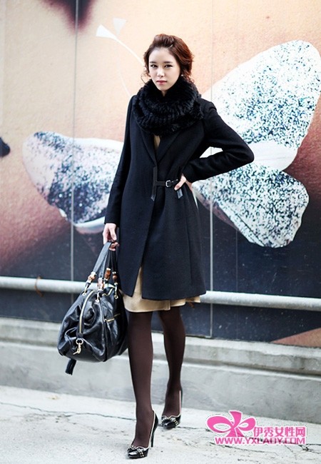 毛领的修身黑色大衣,展现职场女性的干净和利落,修身的造型,宣泄女性特有的妩媚,让你做个刚柔并存的小女人。