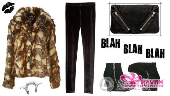 搭配指南:短款皮草外套+瘦腿裤+拉链晚宴包+高跟靴/短款皮草外套+瘦腿裤+金属带拎包+翻毛靴