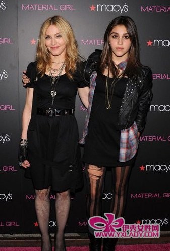麦当娜与女儿站在一起好像姐妹一样。麦姐的女儿自然不是普通之辈,穿起黑色翻领短款皮衣配上格子衫与破洞条纹丝袜带着叛逆的气质,翻领的铆钉装饰增添了一抹时尚韵味。