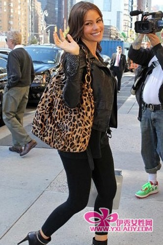 黑色小皮衣的特点在袖口的拉链处,格子的小铆钉装饰为整身的黑色增添一抹亮点。豹纹挎包配上黑色装束是最佳的摩登伴侣。