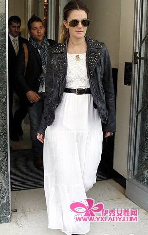 白色的大长裙飘逸性感,搭配黑色铆钉装饰翻领小皮衣是今年秋冬最潮的装扮。高腰的黑色皮带装饰为整身增添了不少亮点。