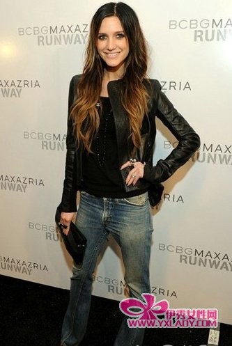 黑色修身小皮衣利落有型,搭配黑色小T下身一条微喇蓝色仔裤干练有型个性十足。