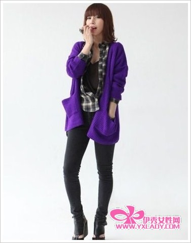 时尚点评:紫色的针织衫虽不及粉色亮眼,但是更显女人的妩媚,内搭格纹衬衫,更显层次。