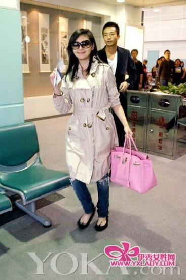大S的卡其色长款风衣相当有型,带着英伦风的帅气又有着舒适休闲的感觉。搭配蓝色的瘦腿裤与平底鞋简单随意。粉色的爱马仕手袋相当惹眼。