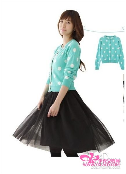 白色圆点绿开衫搭配黑色纱裙更显协调优雅