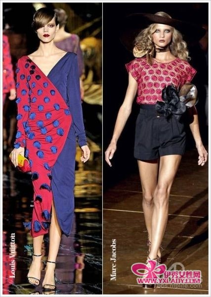 不同材质的圆点更是显示出了设计师的奇思妙想,2011春夏Louis Vuitton融入了东方元素,同时用夺目的色彩和50年代的波尔卡圆点来展现女性的华丽与风情;2011春夏Marc Jacobs设计继续走复古路线,将我们带到70年代,蕾丝镂空拼接圆点、硕大的花朵装饰在腰间,辉映着美丽光彩。