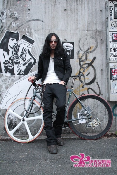 留长发的男人总是让人觉得有些不够利落,不过让人意外的是这个长发飘飘的男子竟然是一位单车男,黑白色的服装搭配简单而干净。
