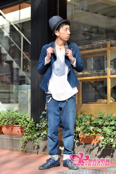 很有喜感的一身搭配,全身以牛仔蓝为主色,但不同质地和颜色的蓝并不会让人觉得单调,一件简单的Tee弱化了蓝色的视觉效应,有些痞但也有些可爱,很赞!
