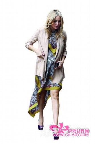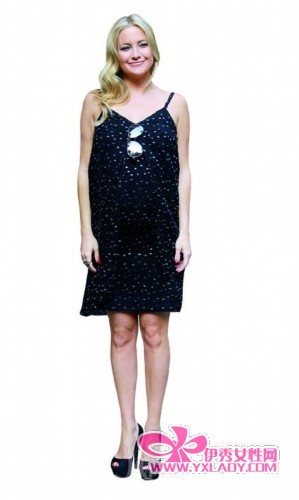 Kate Hudson很懂得扬长避短,突出纤细小腿的同时用星星点点的图案制造出肚不大的视觉错觉。