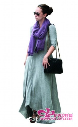 Jennifer Love Hewitt用灰色长裙遮掩日渐隆起的肚子,层叠的紫色围巾简约时尚又保暖。