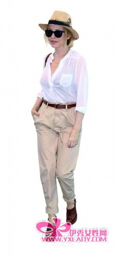 Kylie Minogue这身透视衬衫高腰裤搭配细腰带及同色高跟木屐凉鞋的复古装扮星味十足。