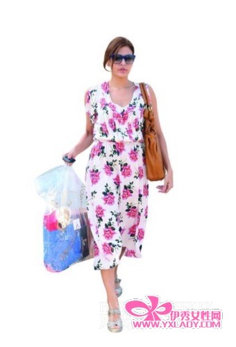 Eva Mendes这身玫瑰印花过膝裙搭配裸色编织鞋的穿着很有时髦主妇的优雅气质。