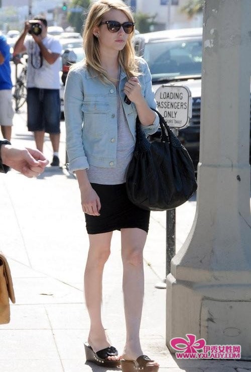 艾玛罗伯茨 (Emma Roberts) 街头风搭配示范。木质拖鞋随意洒脱,超大手袋也休闲味道十足。