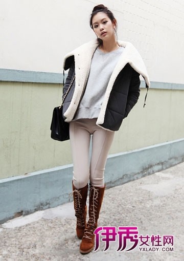 超短款的棉衣成为这个冬天的主打单品,搭配棕色的长筒绑带靴变得更加时髦有品。