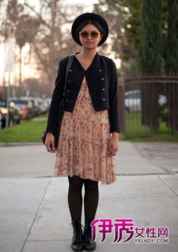 小甜美的碎花连衣裙搭配马丁靴和小礼帽有种学院范儿,乖巧的学生感觉很凸显。