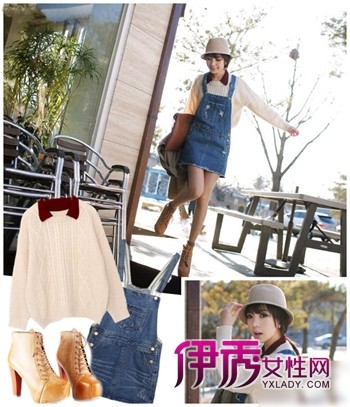 米白色拼酒红色领毛衣,搭配背带牛仔裙+防水台短靴,立即变身为调皮女生。外面搭配军绿色风衣+信封包包,休闲时尚。