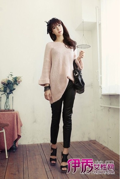 仿皮修身小脚裤,仿皮设计,很有潮范儿,更显欧美风范。裤脚的侧面有拉链开襟设计,很帅气性感,可以搭配粉色宽松针织衫,清爽舒适。