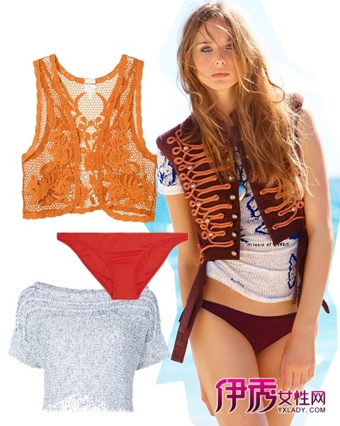 夏日的针织马甲总有种清凉的感觉。橙色的色调正适合海边的热闹气氛。搭配红色的比基尼,让暖色调更加统一。