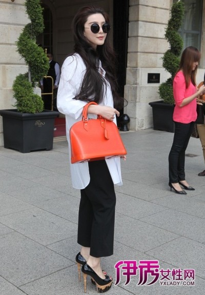 范爷“处女秀”开始前的几个小时,在巴黎街头可以捕获到她的倩影,在享受休闲时光的她白色的Oversize衬衫,搭配小喇叭丹宁裤,依旧不肯放弃小圆墨镜的修饰,与在机场那人同款的橙色LV包包与造型依旧很吸引眼球。