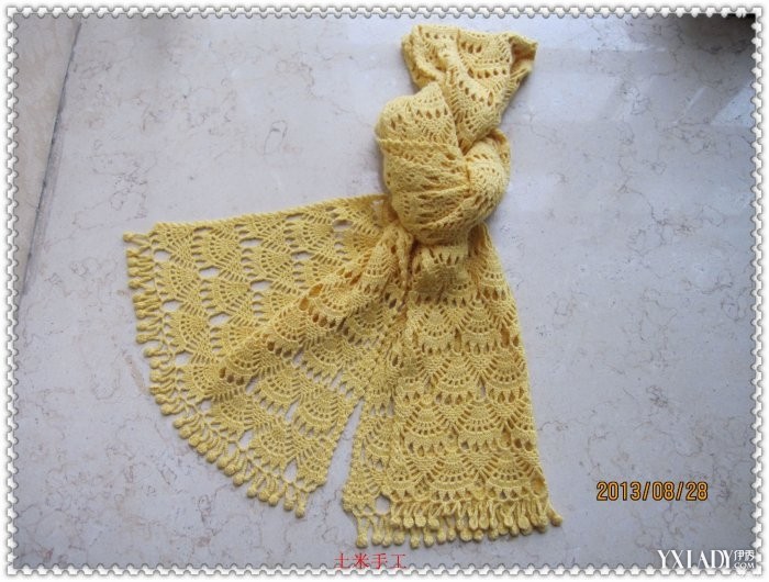 围巾是应邀给别人加工的,她在我存的围巾图片里看上了这款。有图解,照着图解,从中间往两头钩的,长短可根据自己的爱好定,如有喜欢的姐妹可以照着钩织一条哦。方便阅读,围巾的花样图解放置于下一页 编织人生论坛相关帖子