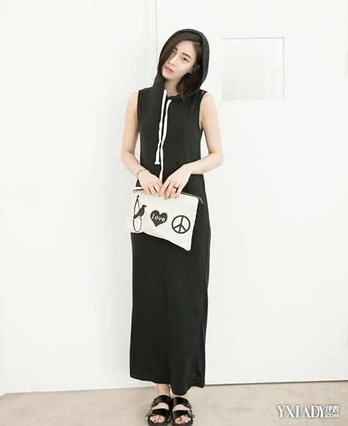 运动风连帽无袖连衣裙+黑色皮革凉拖