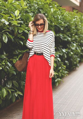 搭配要点:条纹T恤+红色高腰百褶裙+棕色单肩包+渐变墨镜,条纹不仅能够显瘦,而且是永恒的经典,所以各位不妨试一试哟。