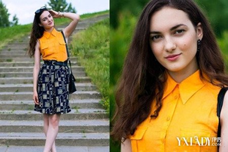 3、橙色翻领衬衫带有浓郁的复古色彩,让人不禁回想起上世纪时尚女郎的俏丽与摩登,下装搭配黑色图案高腰中长裙和黑色高跟鞋,优雅大方。