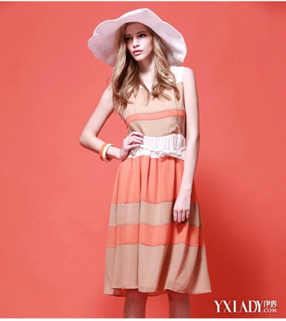 夏装时尚气质橘色百搭条纹雪纺连衣裙