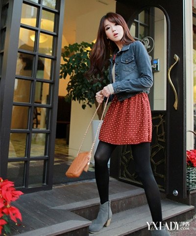是很常见的秋装搭配,帅气的牛仔外套一样让MM们穿出甜美感来呢,橘色搭配上波点,俏丽可爱呢,黑色的