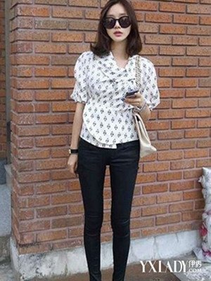 设计很可爱的印花衬衫,泡泡袖能遮盖手臂赘肉,搭配黑色紧身裤和坡跟凉鞋,更显高挑身材。