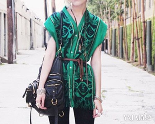 绿色披肩式上衣,精致的部落图腾以及流苏增加了几分嬉皮士的味道,细腰带的搭配让下身比例拉长,黑丝袜以及黑色高跟短靴,勾勒修长美腿,加上黑色爵士帽以及墨镜,完全欧美风的演绎。