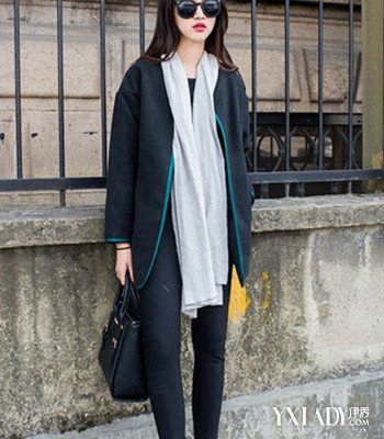 英伦风开衫,线条明确的剪裁,内搭T恤,整体看上去十分的干净利落,搭配一条围巾和黑色小脚裤,范儿十足~中长款穿着很有型,而且很保暖的说。