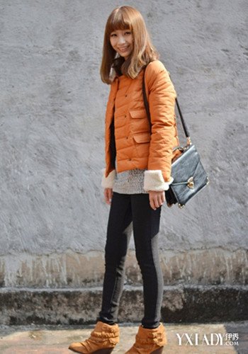 黑色小脚裤搭配浅棕色短靴,为你增添了几分娇俏。上身可穿搭灰色长衫加橘黄色的棉衣外套,背上黑色斜挎包,展现了多面的女性温婉风采。