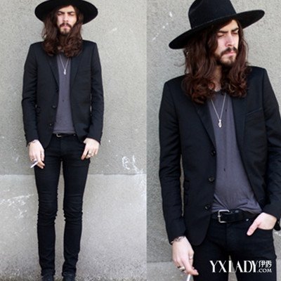 这是一款非常帅气的男装搭配打扮,散发着浓浓的英伦绅士气息。一件深色系的圆领桑怡,搭配黑色的翻领西装,利落的剪裁,为整体的效果加分不少。有链条搭配,更是好看。