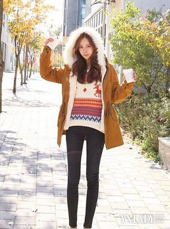 在阳光的照射下,黄色休闲款棉衣外套显得格外迷人,真的是很阳光活泼,收腰的设计让MM保持了美好的造型,毛绒帽子的穿戴更显小女生俏皮可爱的一面,在阳光的冬季这样的搭配很流行,既可保暖又可以追潮流!