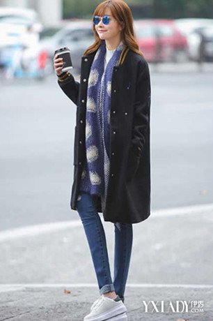 中长款韩版无领刺绣毛呢大衣,内里搭配白色立领打底衫和小脚牛仔裤,穿双时尚休闲鞋,系一条好看的蓝色围巾,很有街头时尚范,极显魅力,潮流女生必搭~