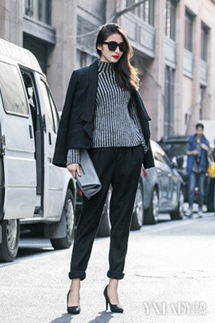 搭配看点:小西装套装也是职场MM必备的时尚单品,首选当然是黑色,白色和粉色近来比较流行,不过搭配比较花心思哦。帅气的黑色小西装套装内搭黑灰色竖条纹打底衫,摩登感十足,再搭配一双黑色浅口高跟鞋拉长腿部线条,气场更加强大,黑色墨镜和手拿包很有职场女王范儿。也可以选择内搭简约的素色T恤或衬衣,比较容易驾驭哦,但是配饰细节上一定要搭配潮流感较强的单品才抢眼。
